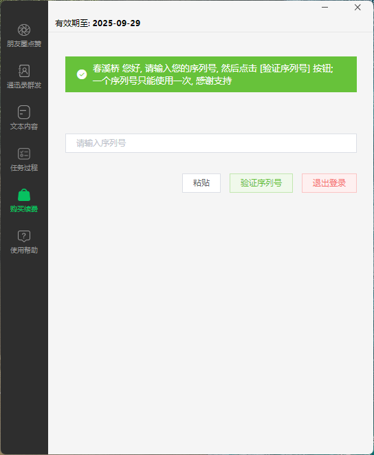使用验证序列号进行激活软件。购买或者激活成功以后,软件会出现到期时间提示。